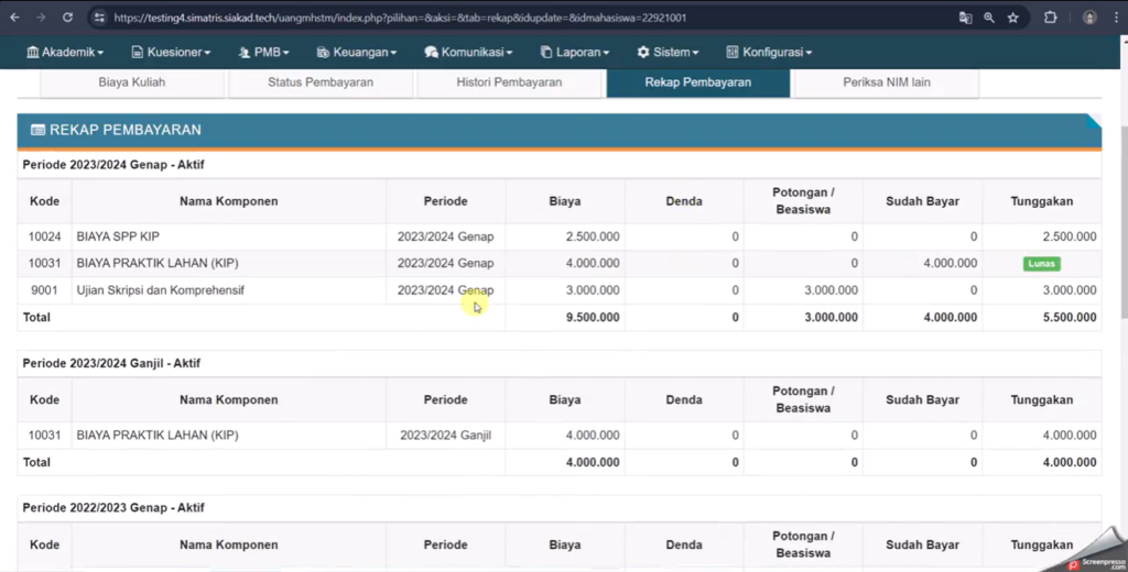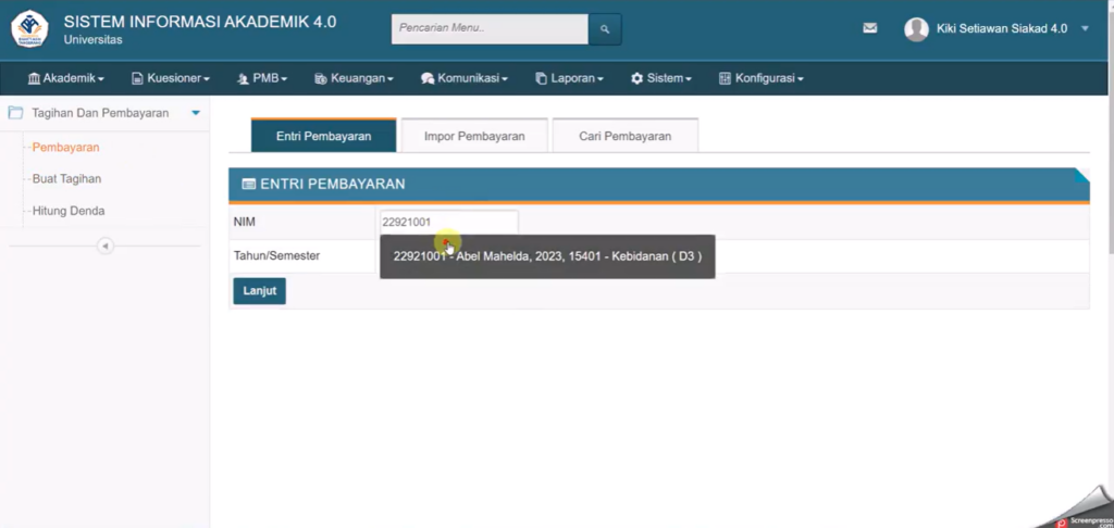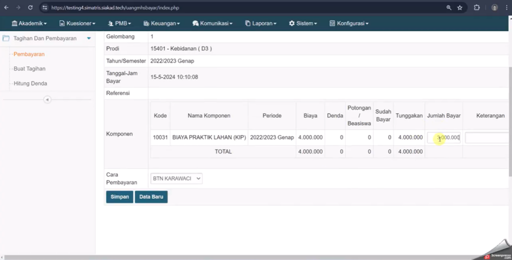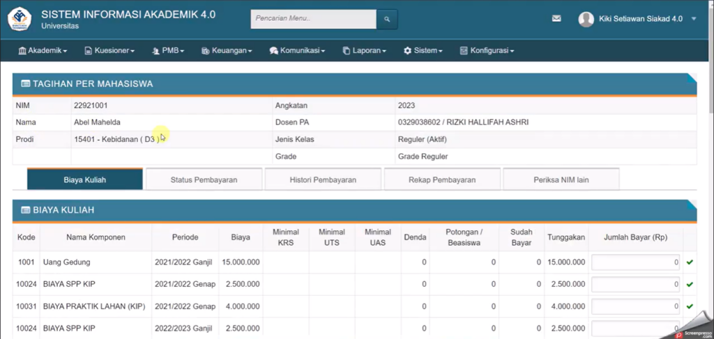3. Simpan data, lalu refresh menu Keuangan > Tagihan per Mahasiswa untuk memastikan pembayaran sudah tercatat.