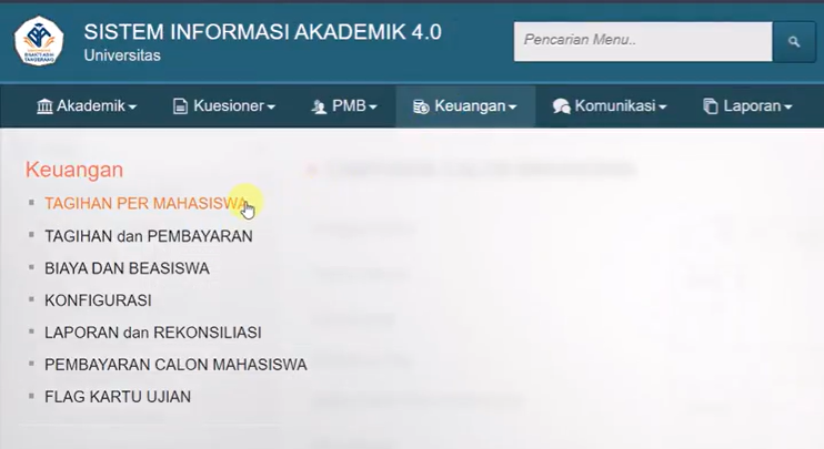 1. Masuk ke menu Keuangan > Tagihan per Mahasiswa.