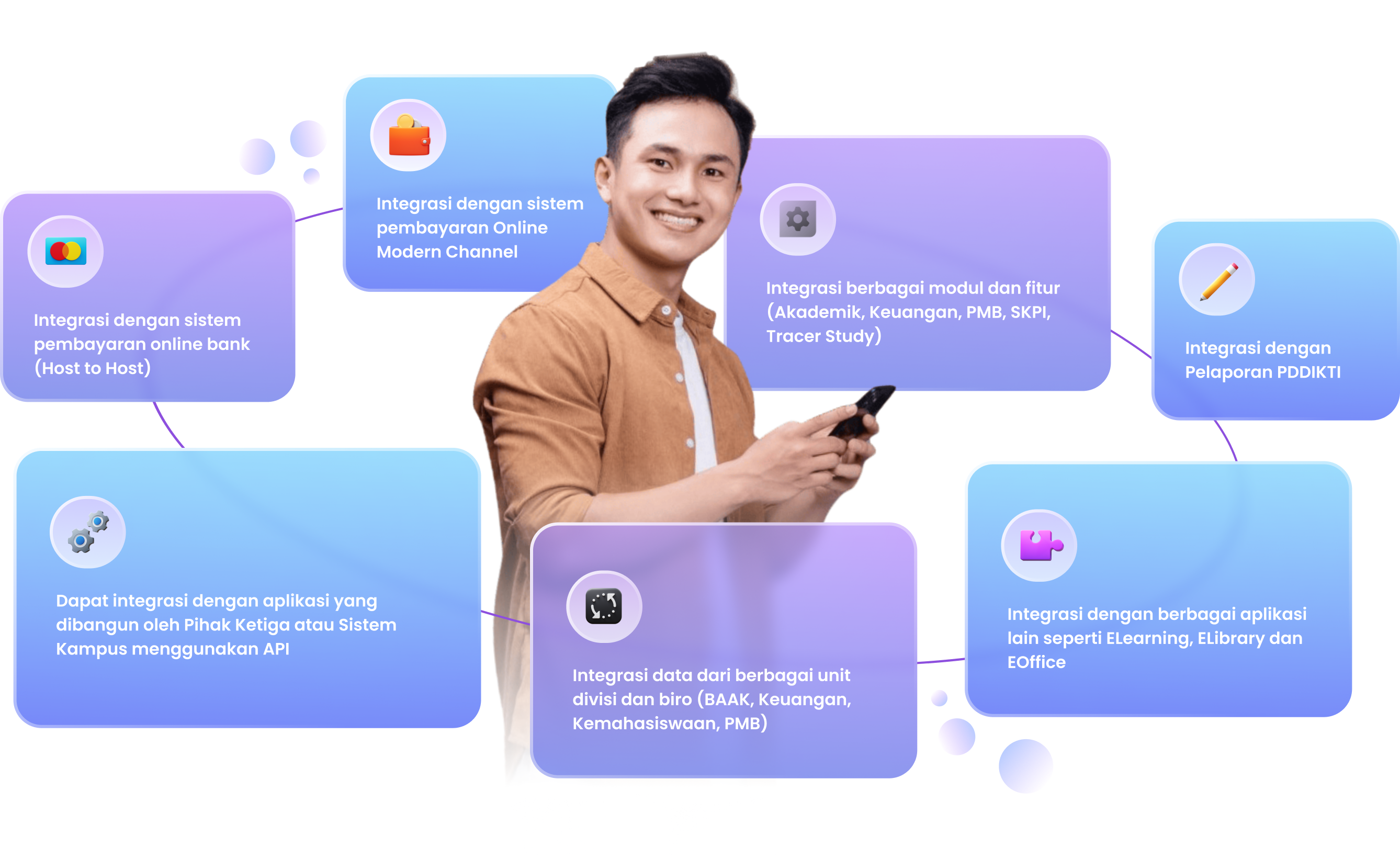 Integrasi aplikasi dan data merupakan salah satu kunci utama pekerjaan yang efektif dan efisien. Berbagai modul pada SIAKAD 4.0 telah terintegrasi dengan baik serta juga dapat terintegrasi dengan aplikasi luar sebagai pendukung proses bisnis di perguruan tinggi.